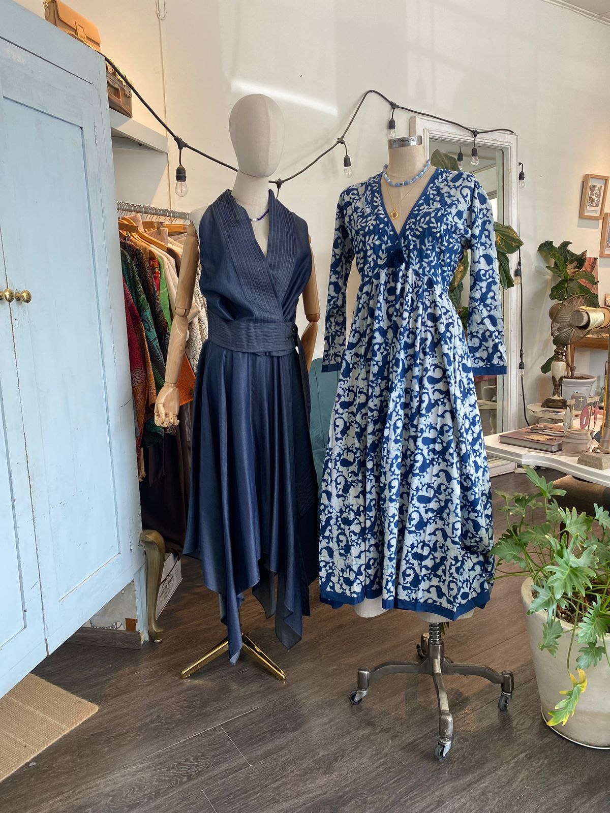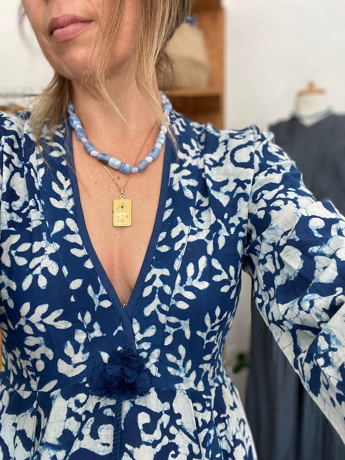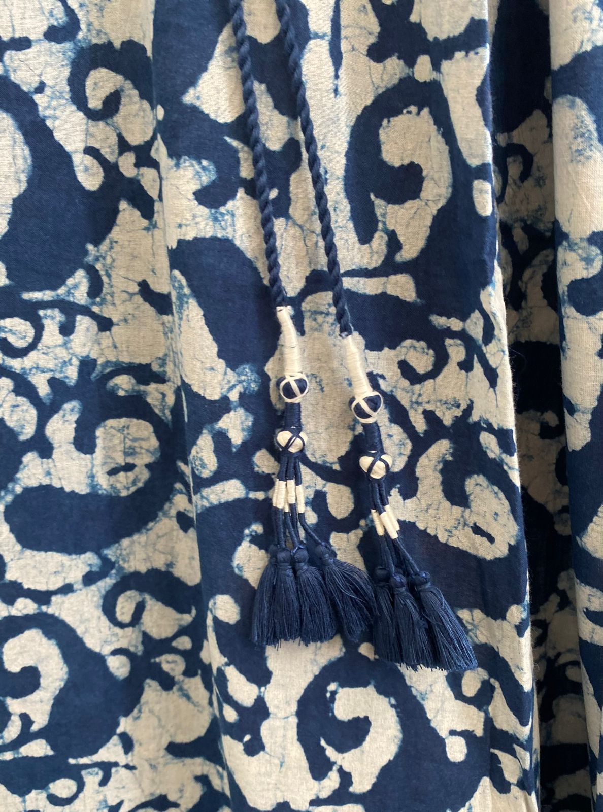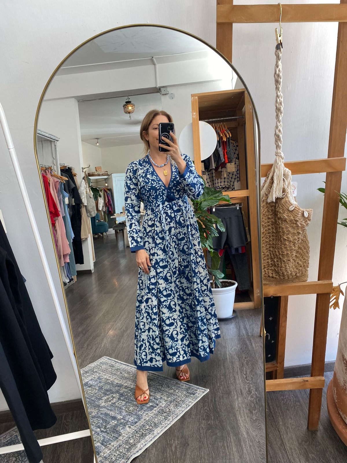 Vestido manga larga, cuello V , color azul índigo , pintado a mano , cierre en costado