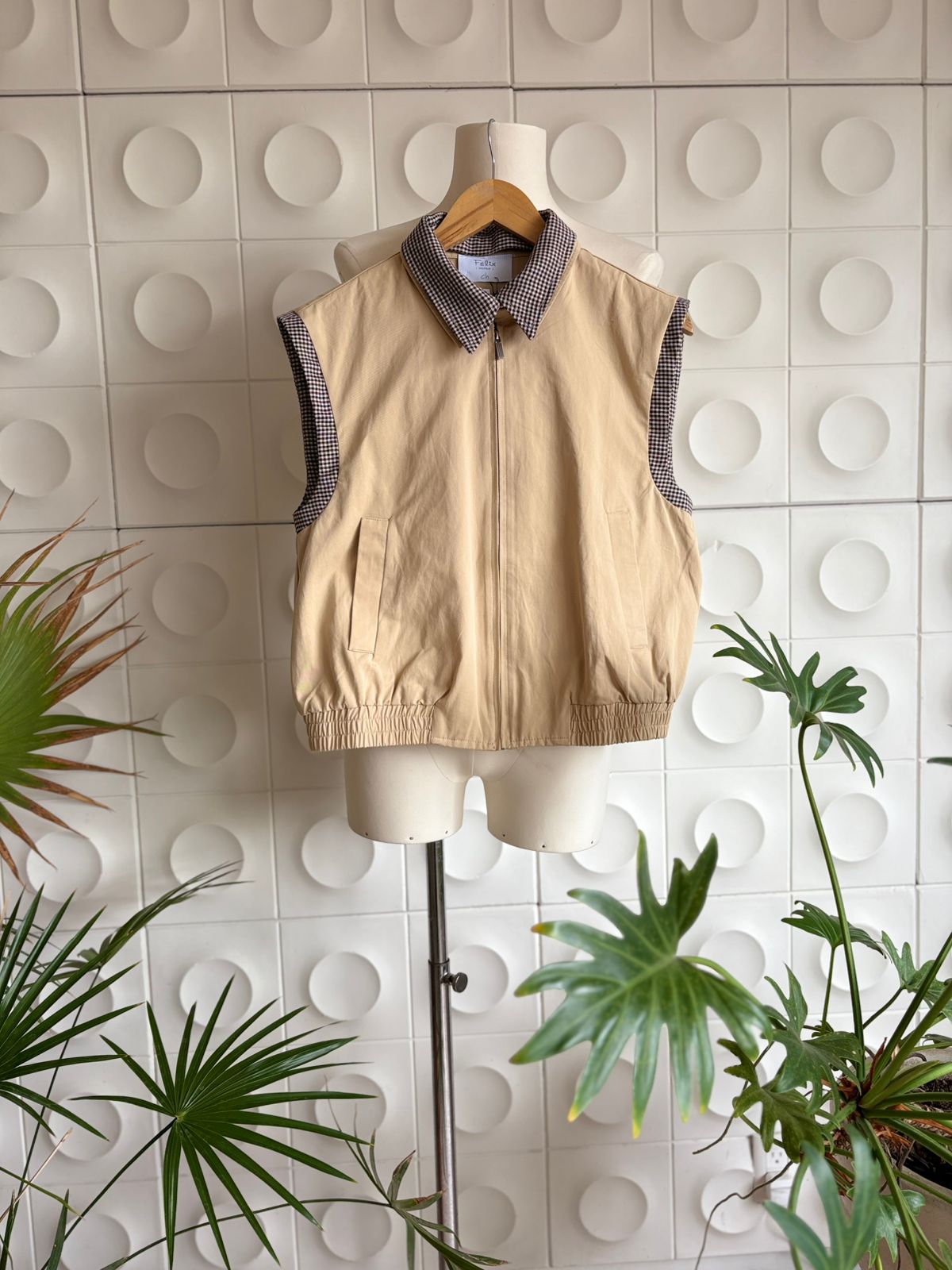 Chaleco kaki con cierre , detalle de cuadros cafés en cuello y manga