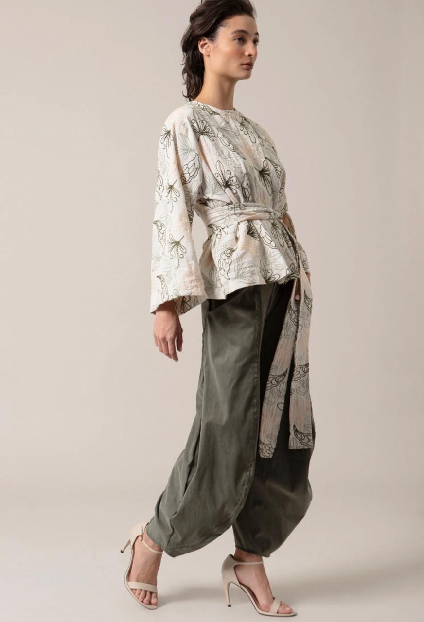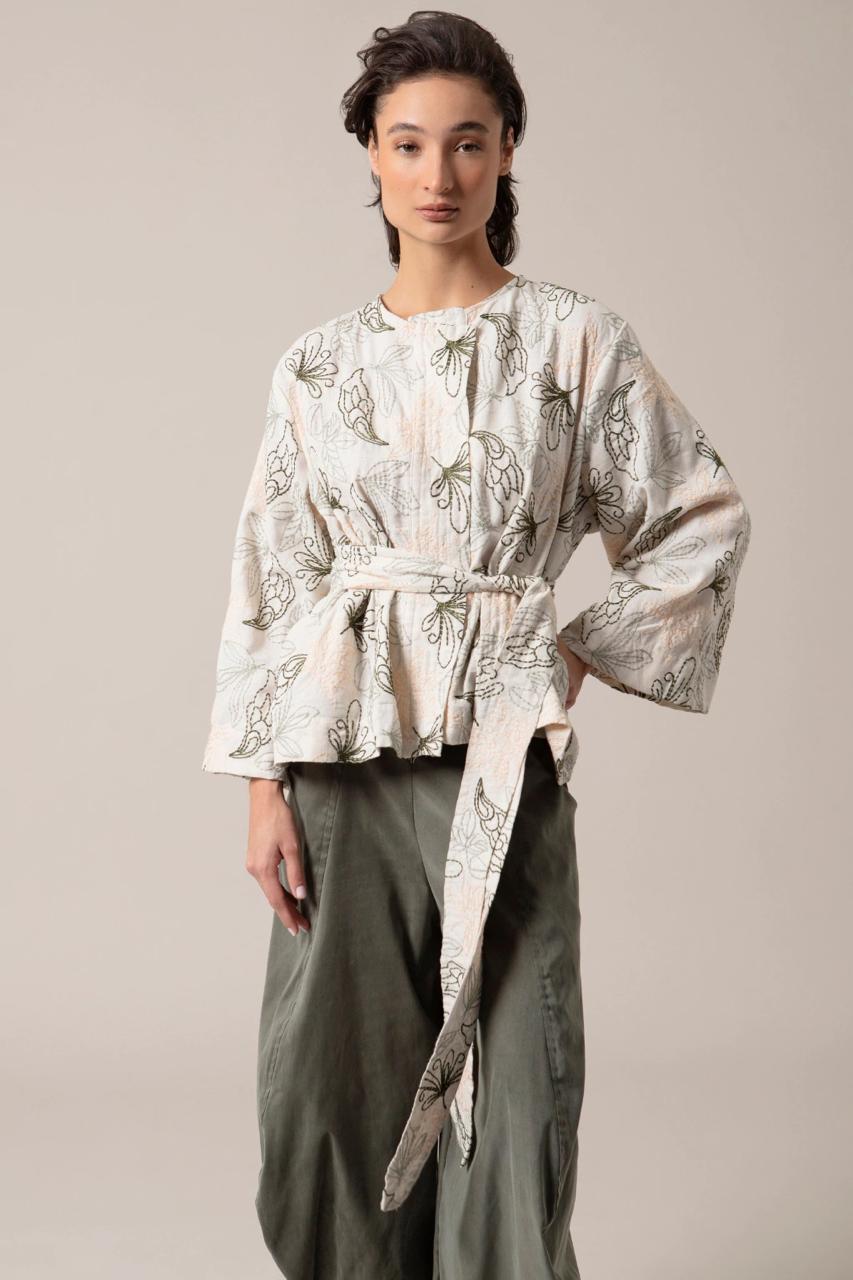 Saco manga larga con cintó de la misma talla en Lino bordado
