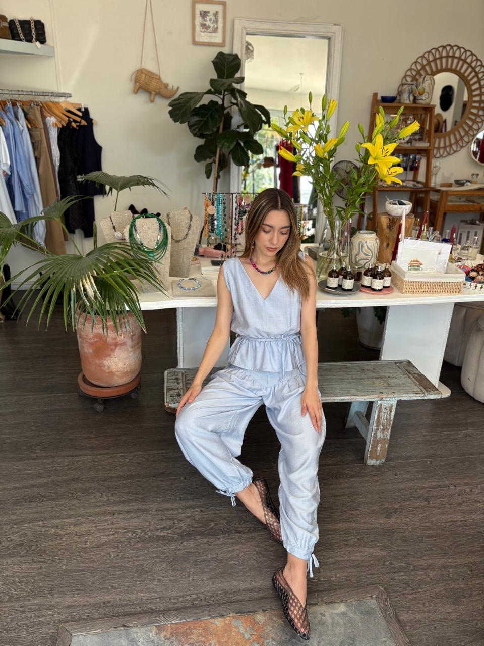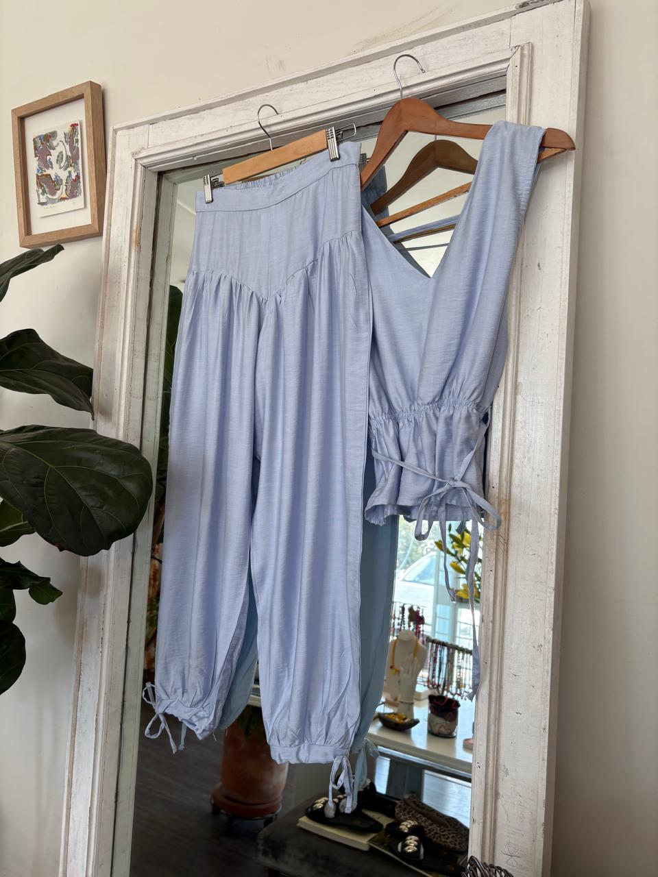Pantalón en color azul cielo , estilo aladino , peto alto y bombacho abajo con cintas