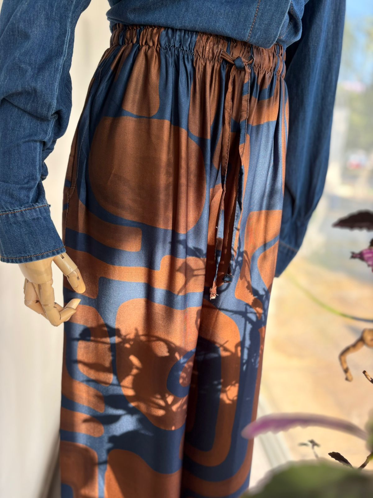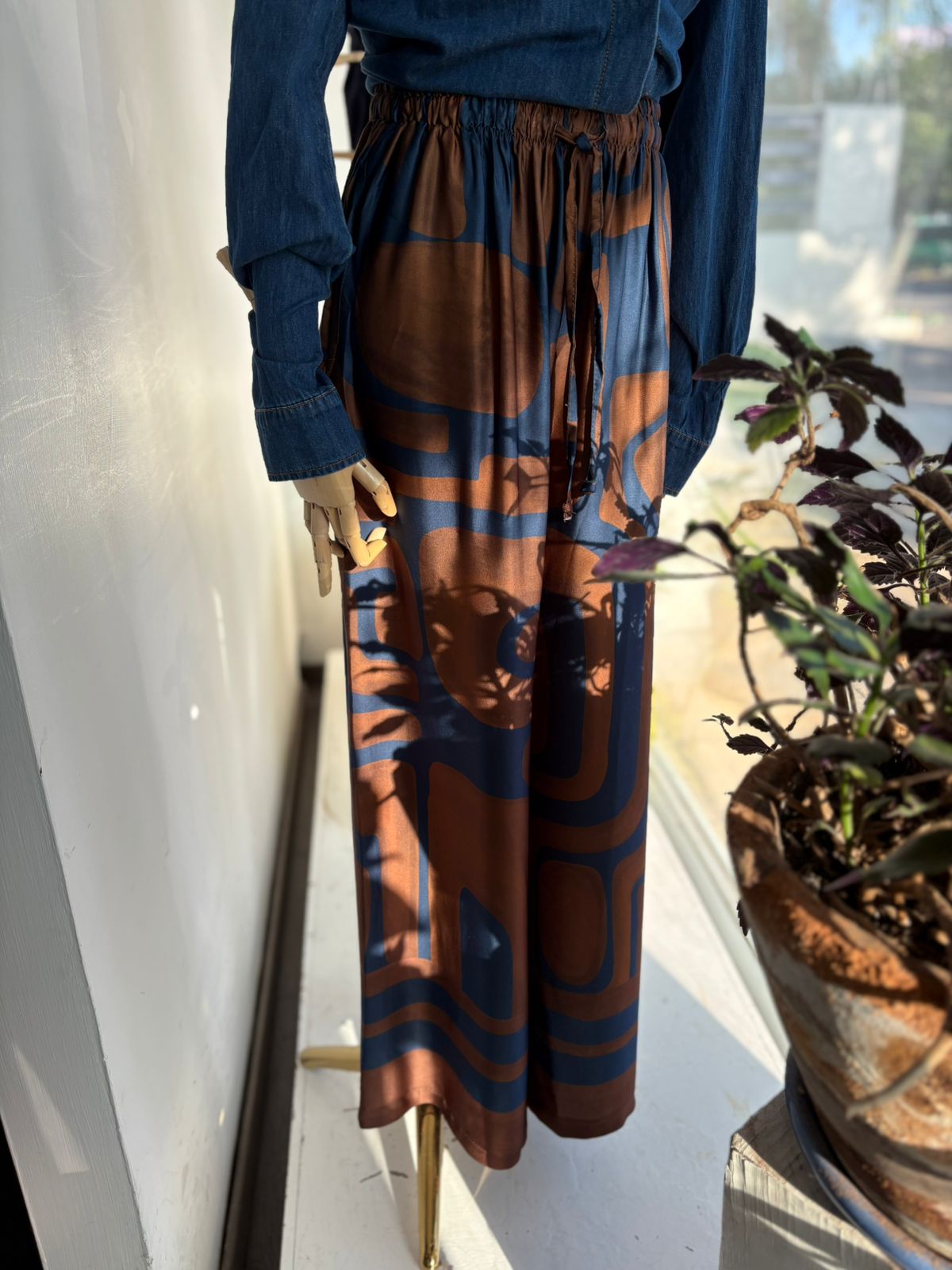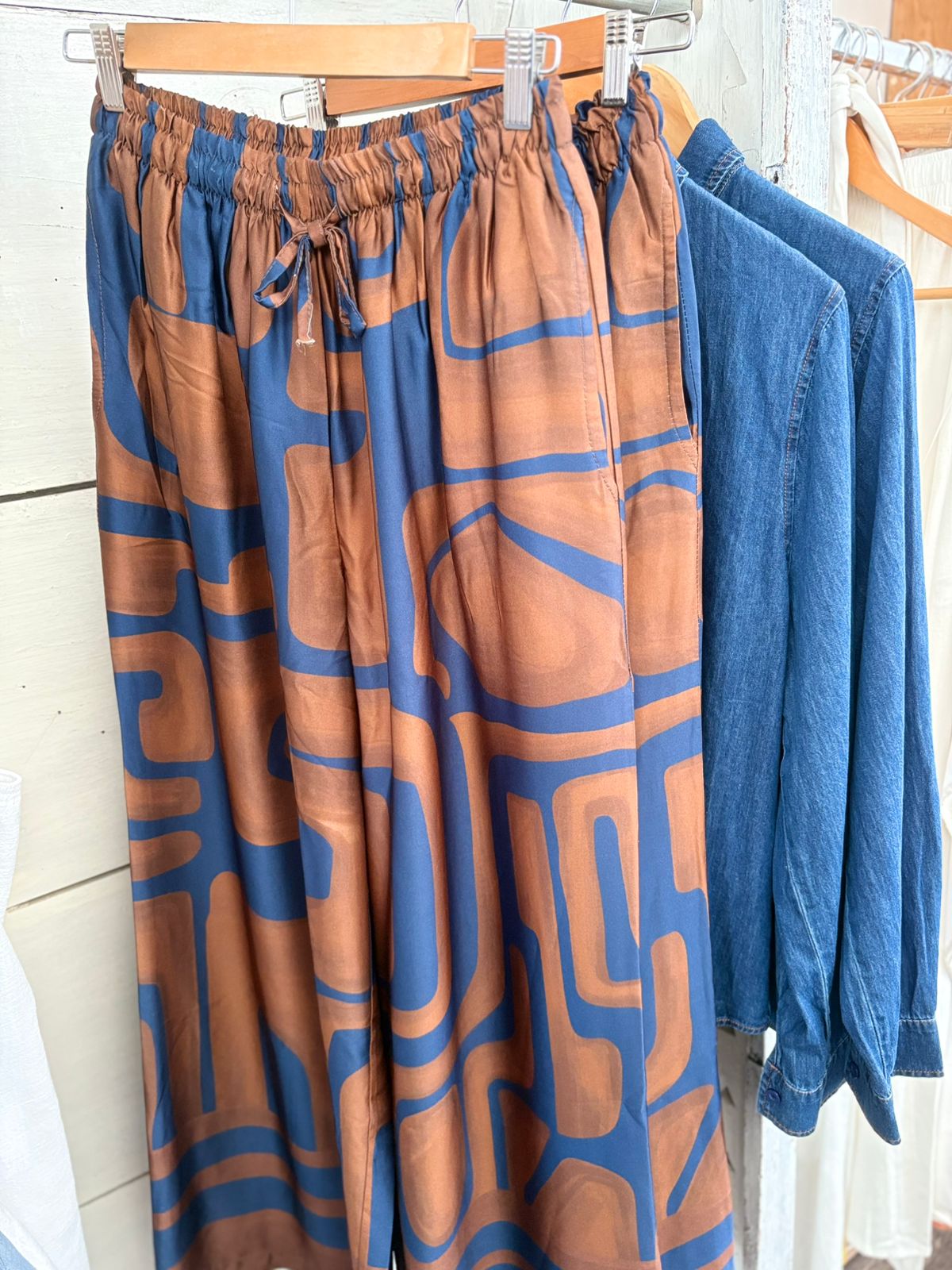 Pantalón tela fluida estampada en azul con café , de resorte en cintura y jareta para ajustar