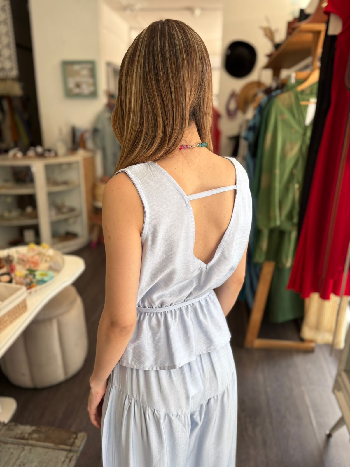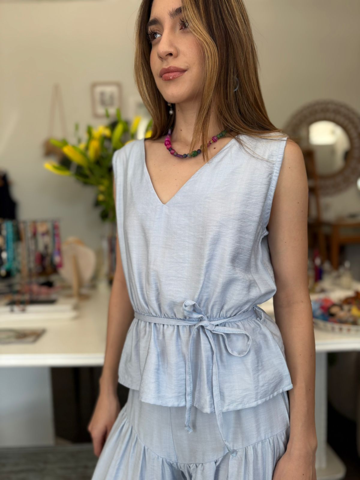 Blusa en color azul bebé , escote en espalda , cuello V , resorte en cintura con un lazo de la misma tela