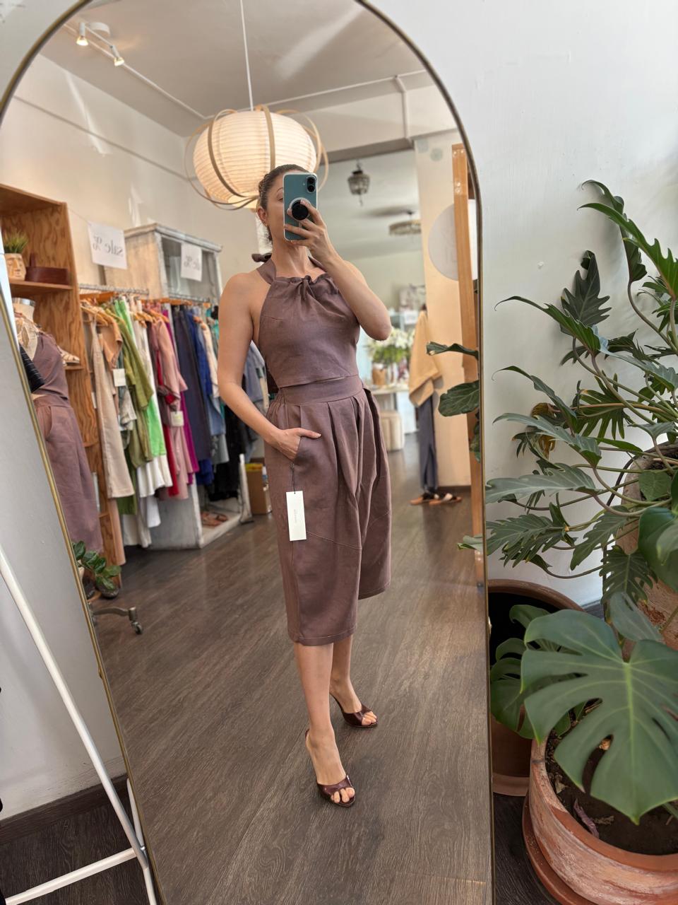 Blusa halter en lino 100% se ajusta de cuello y de espalda, detalle de costura en pespuntes claros