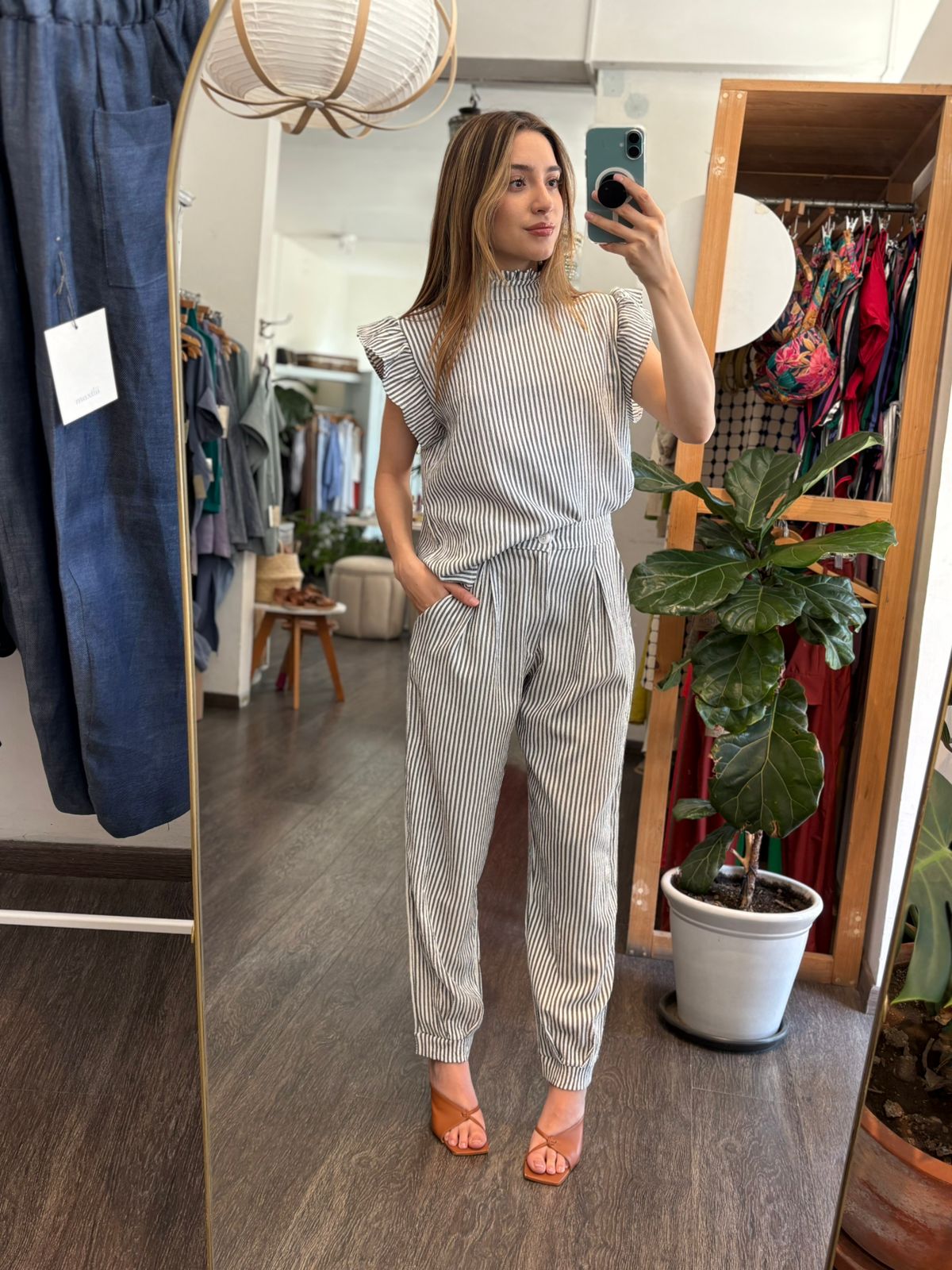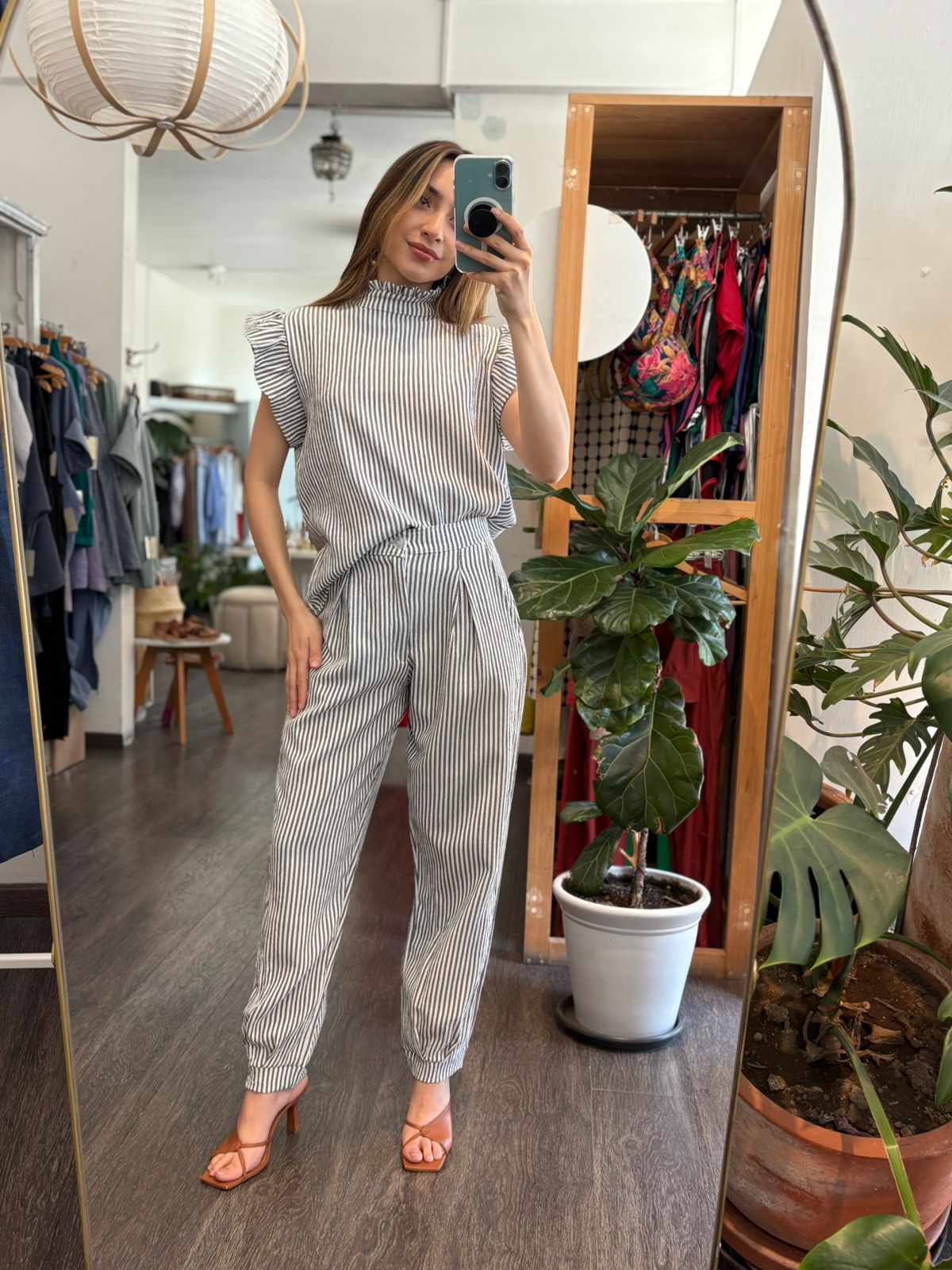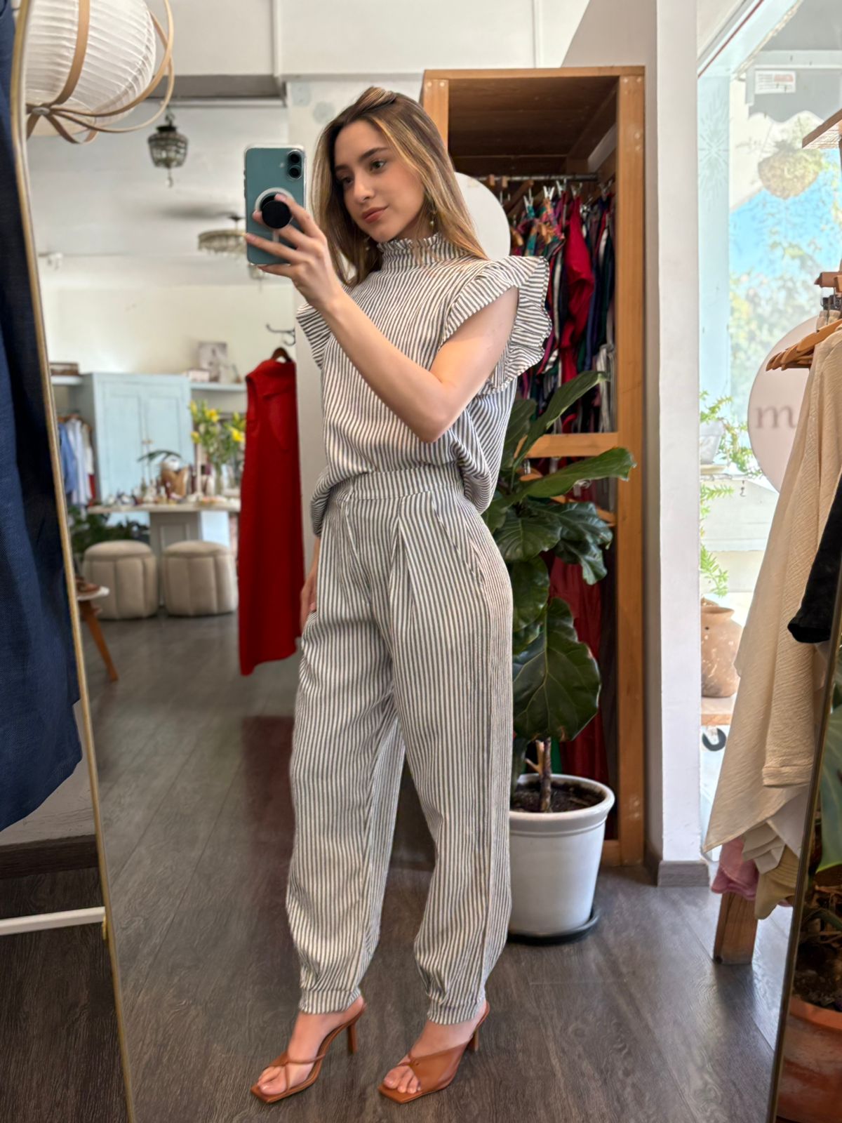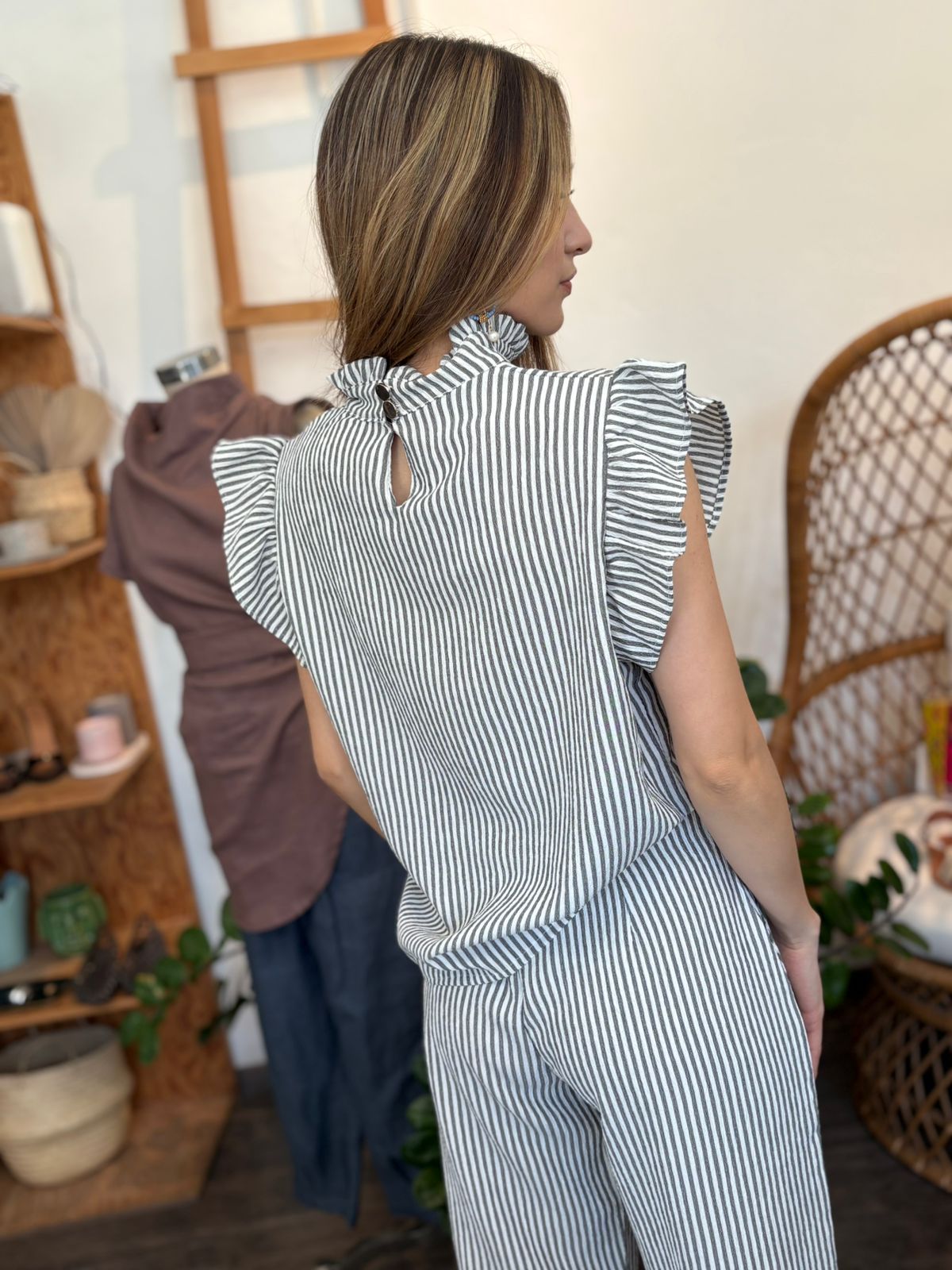 Blusa rayada en color negro , cuello alto con botones en parte de atrás , olan en manga