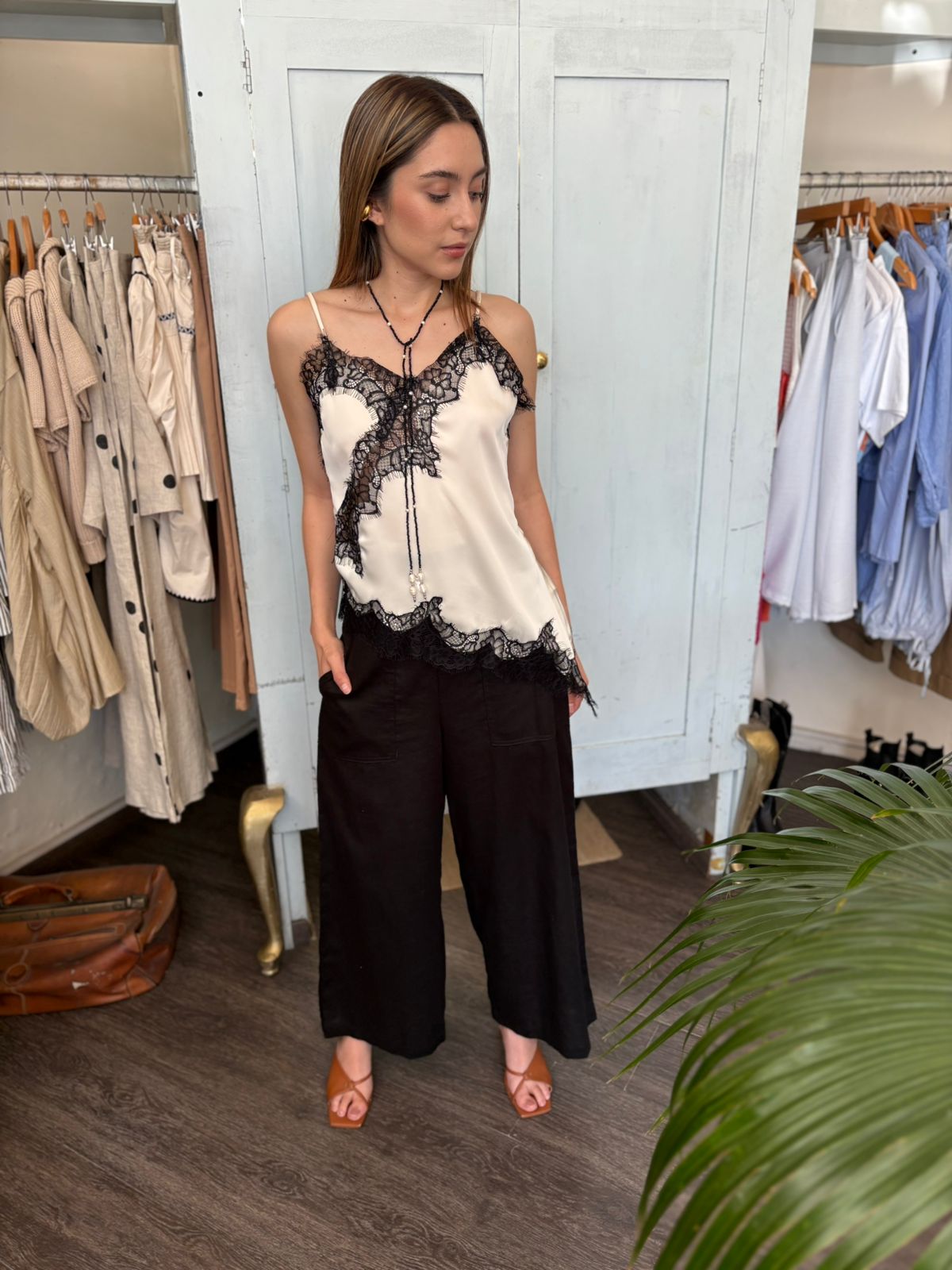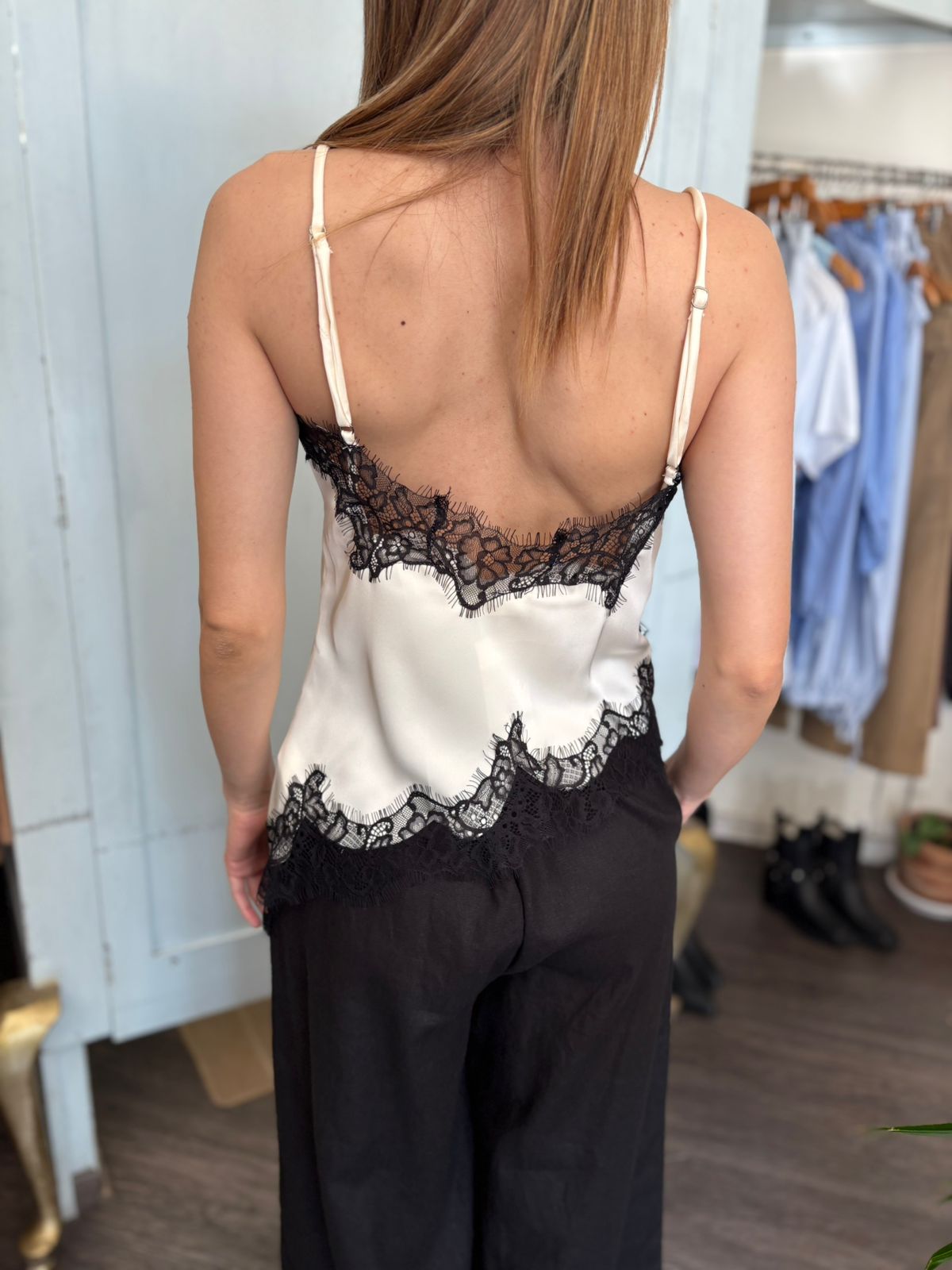 Blusa slip satinada color claro , tirantes ajustables con encaje en color negro