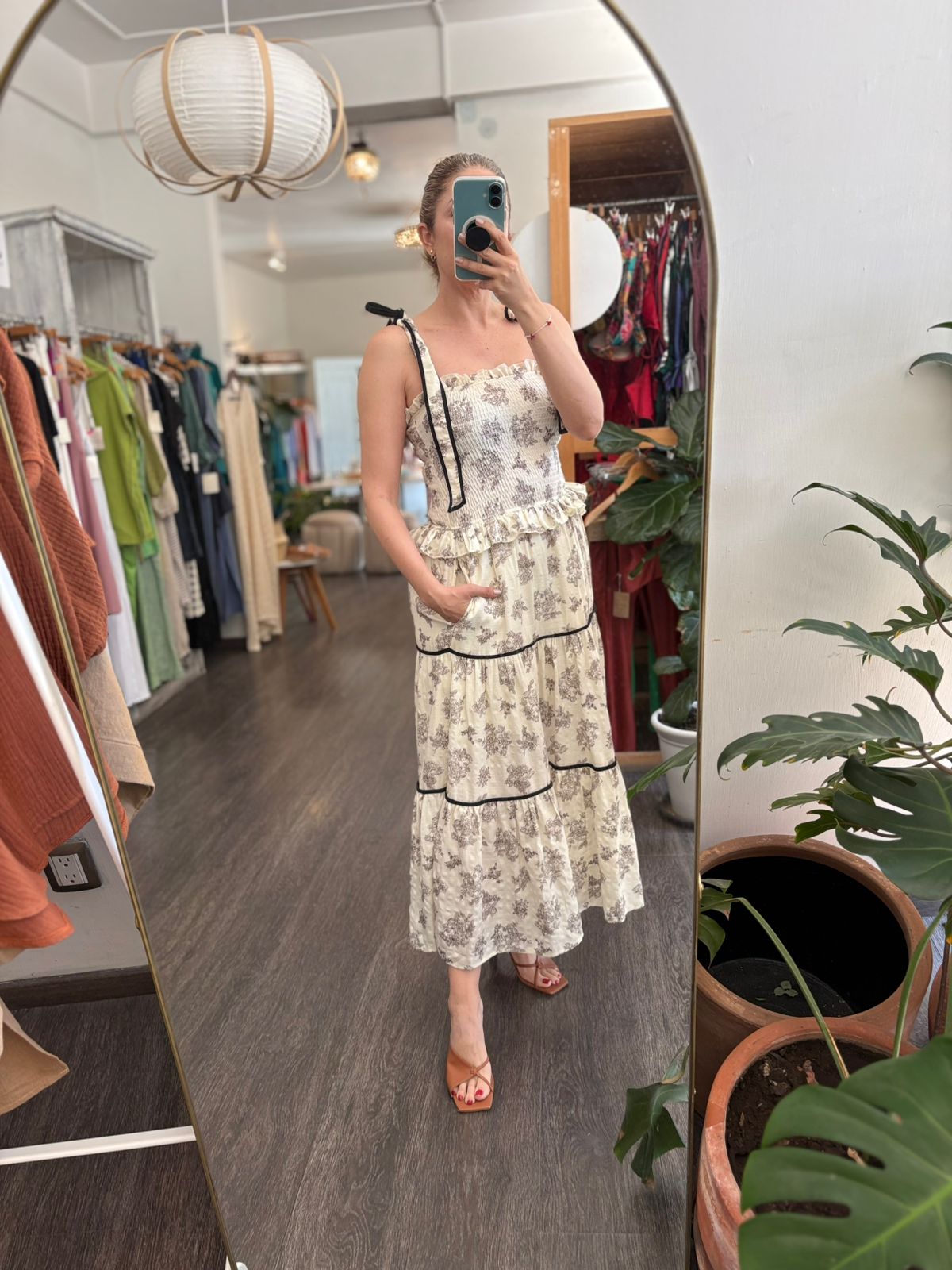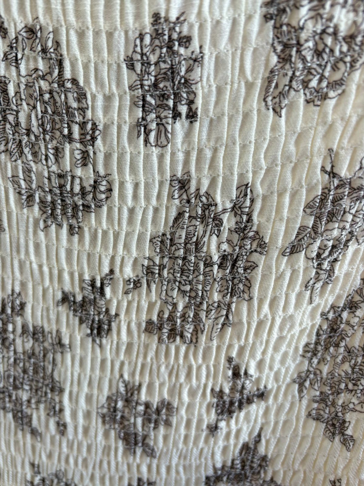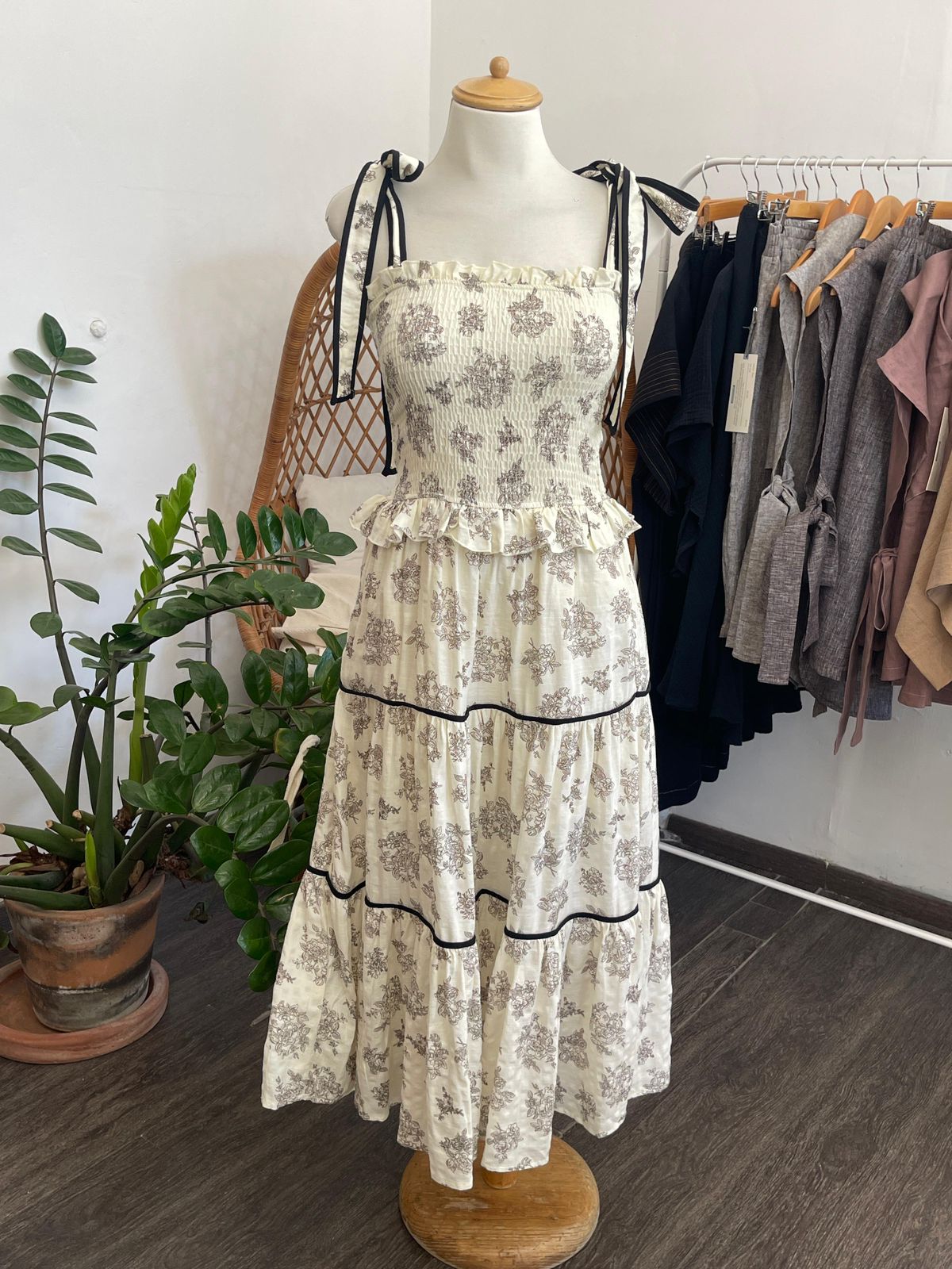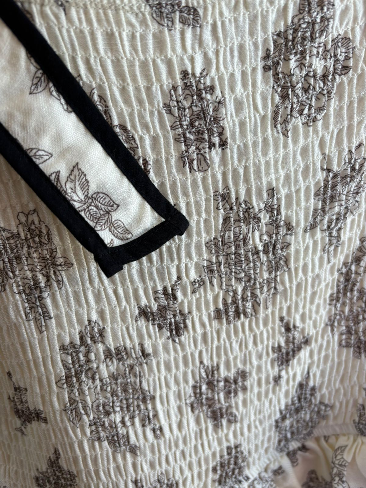 Tela color crema con flores en color negro , se ajusta de hombros , bolsillo a los lados y está forrado