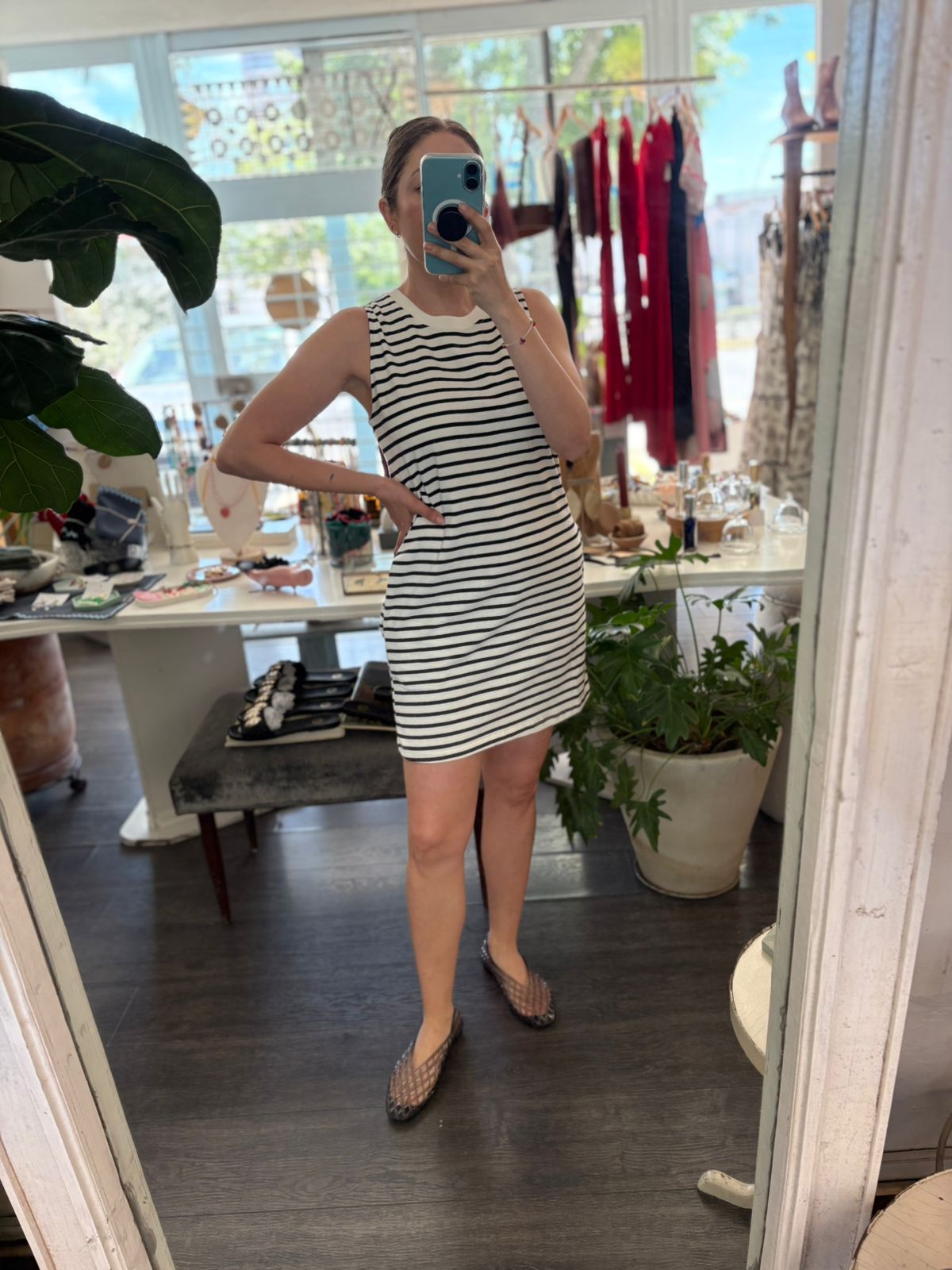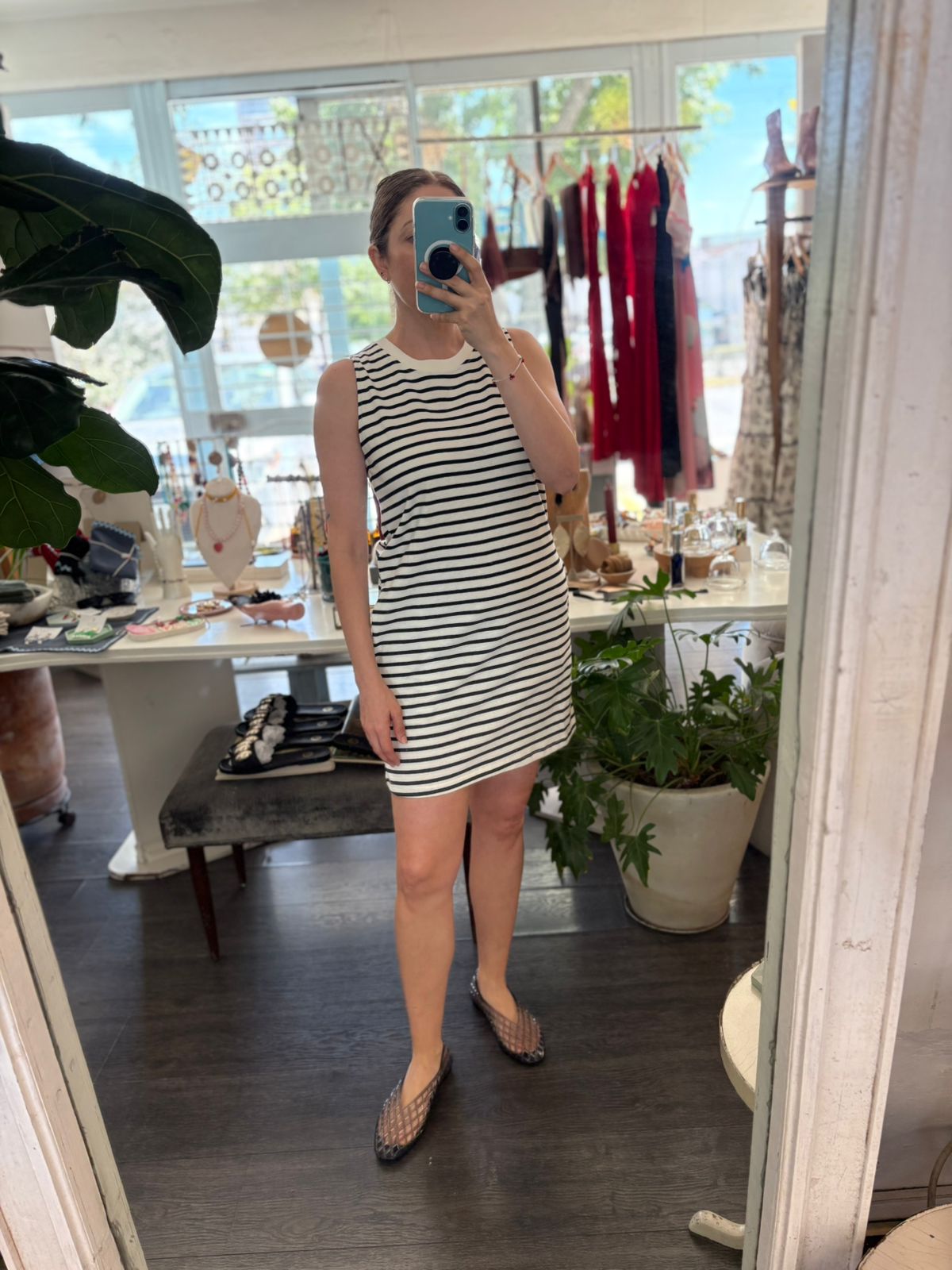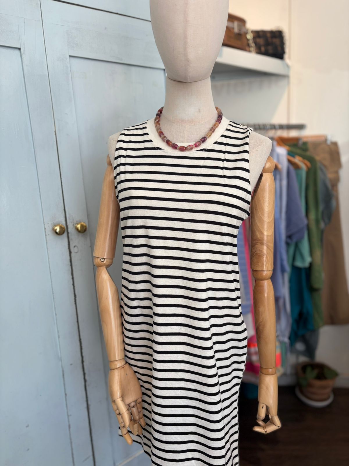 Vestido en rayas blanco con negro , bolsillos a los lados