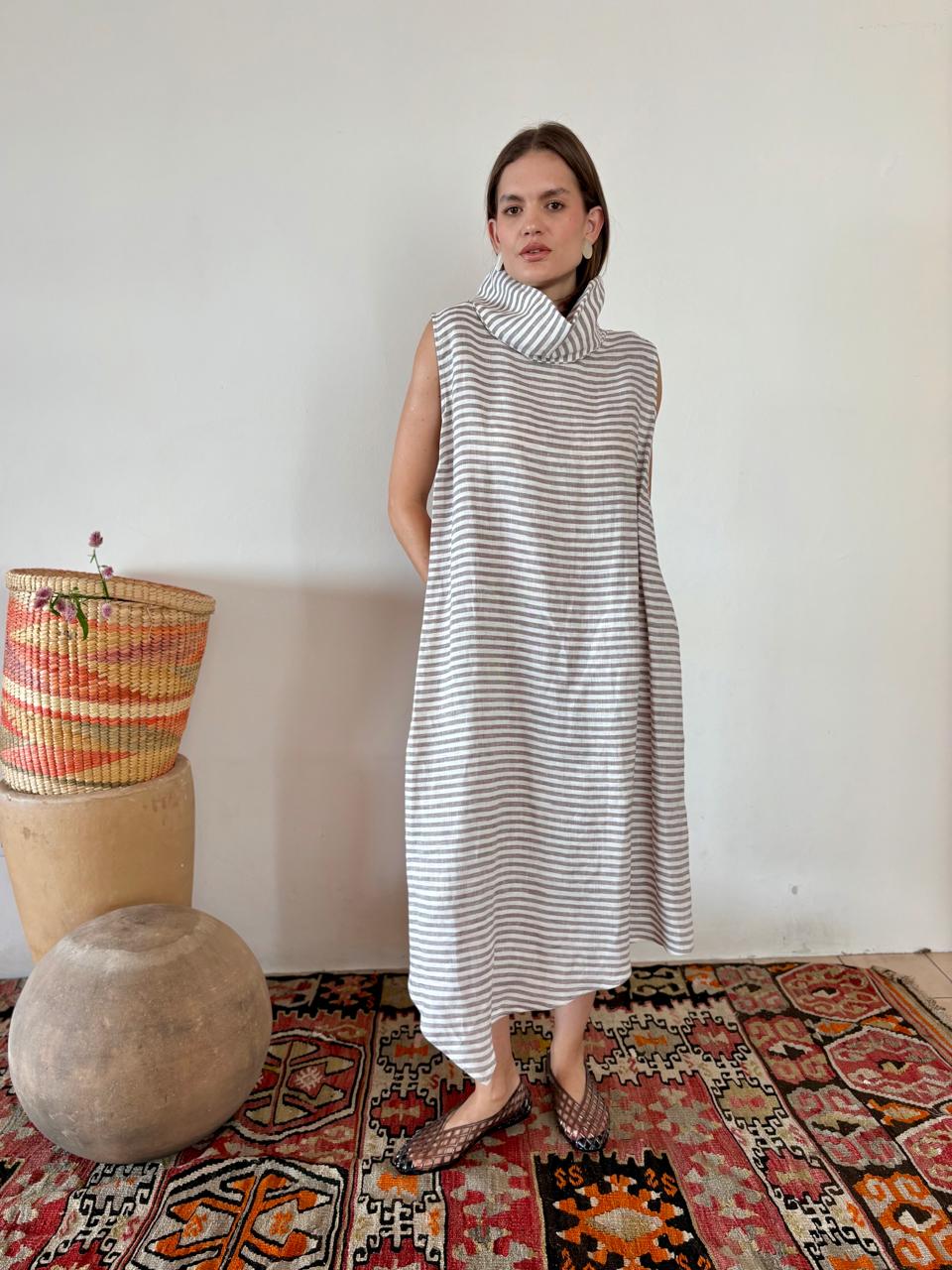 Vestido en Lino 100% rayas kaki con blanco , bolsillos a los lados , cuello alto