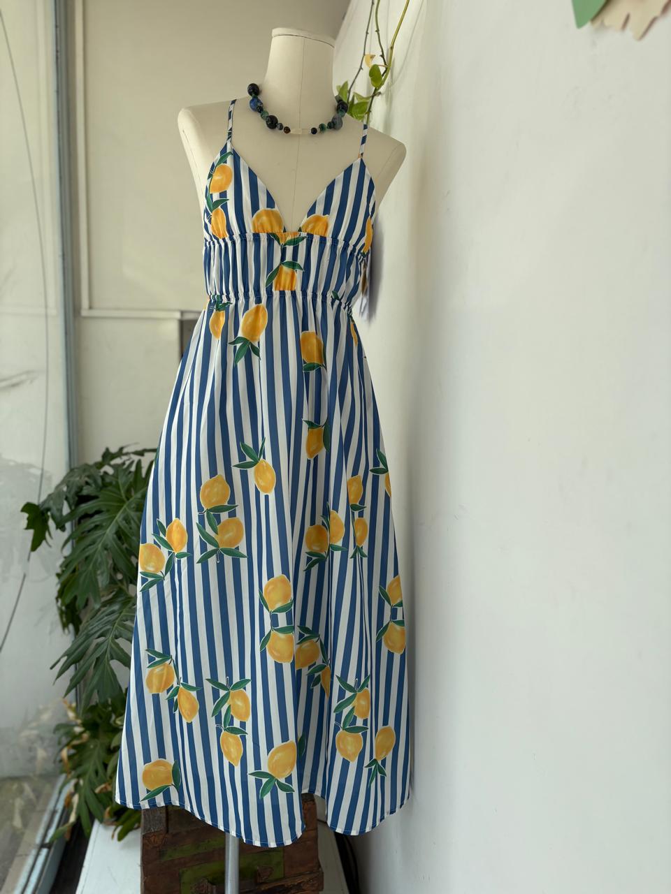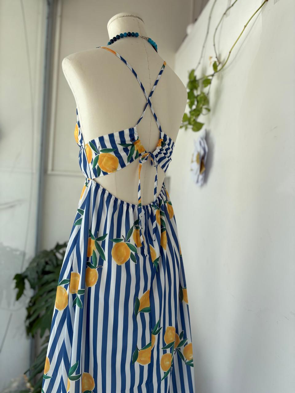 Vestido en rayas azul y blanco con limones se ajusta en espalda