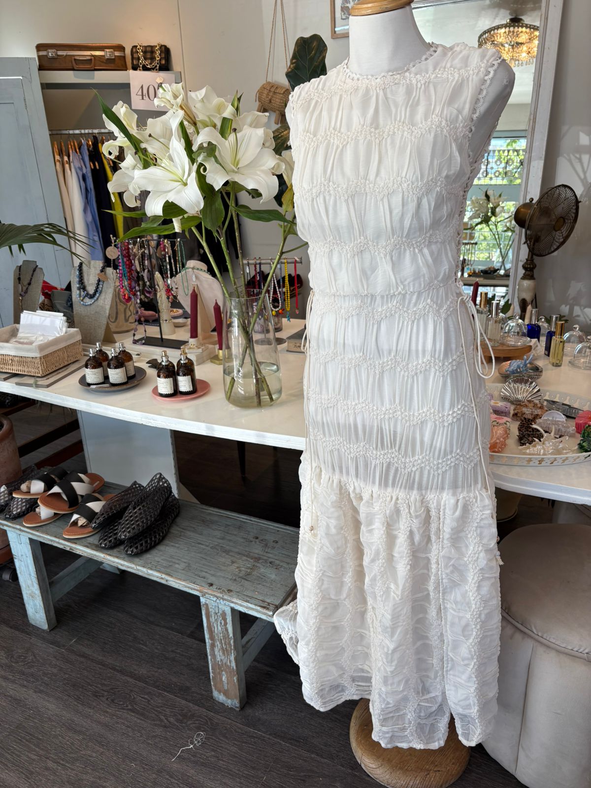 Vestido corto , tela estampada con brillo, olan en escote, manga lara, drapeado en cadera, cierre en costado, forrado